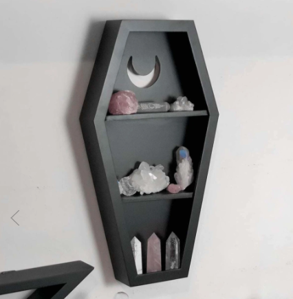 Starting small with your strange collection? Try organizing it on this adorable, coffin-shaped wall shelf. It’s perfect for holding crystals, a tarot deck, small candles, or even select medical oddities.