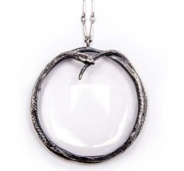 Now for something you can wear and display comes the Ouroboros Large Spyglass Necklace from Philadelphia-based independent jewelers Bloodmilk. A rustic but chic silver snake coils tightly around a crystal clear magnifying lens, here meant to represent “looking closer with intention and attention to detail,” and nestled snugly amid the ouroboros, an ancient symbol that references the cycles of time and nature.