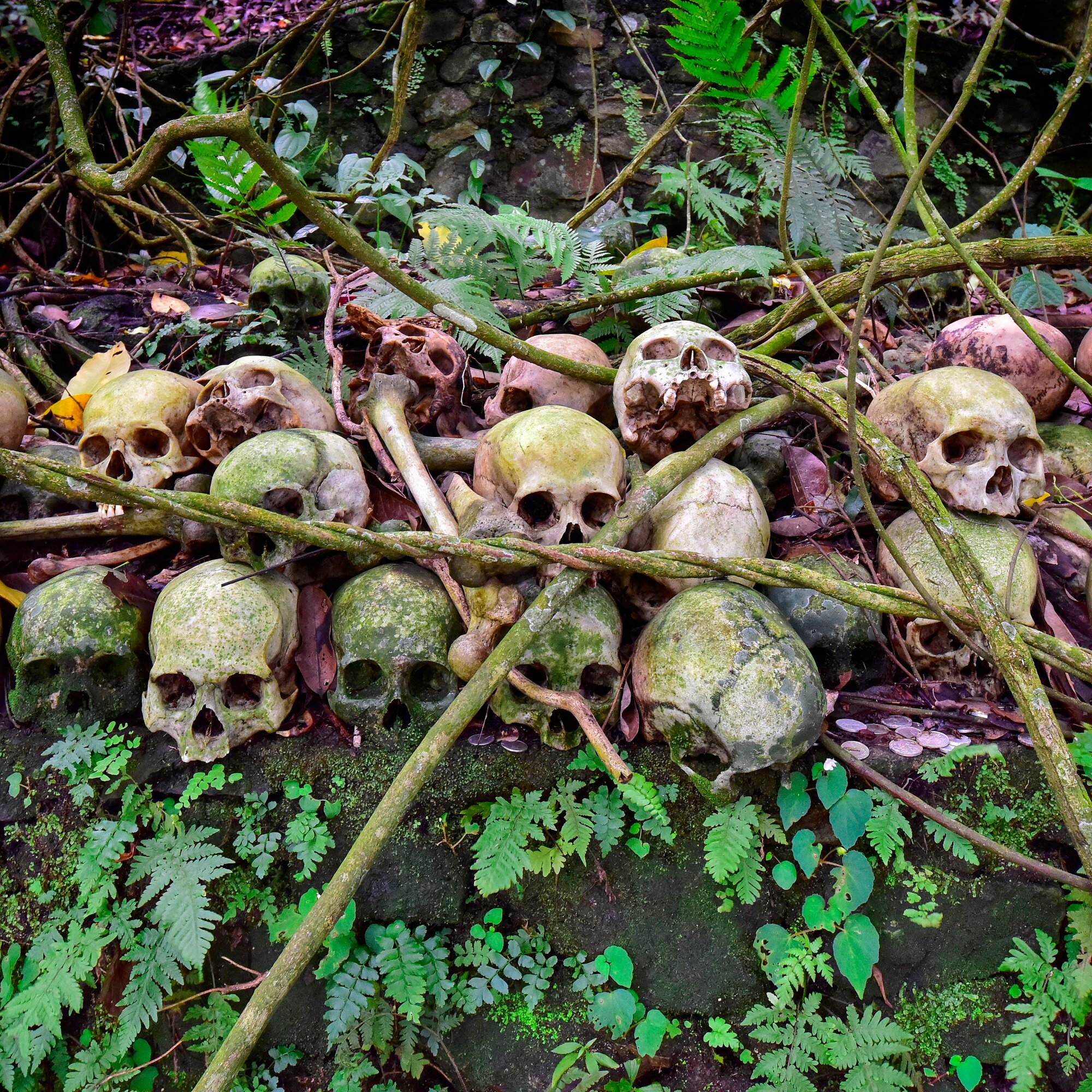 Dozens of moss green skulls are visible piled atop rocks, "almost like artwork", says Juli. He points to bones that lie scattered in the thick undergrowth, some moved by humans, others by animals.