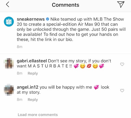 Just as I’m writing this, for instance, Sneakernews (which has over 9 million followers) posted a new picture on its Instagram and one of the first comments says “you will be happy with me look at my story.” Then, if you go to the profile of the person who left that account, it’s filled with pictures of a half-naked woman, whose bio reads: “ready to serve sex chat | sex video calls | walk together and drink together | have sex.” That’s followed by a “check directly on my link,” which redirects you to dubious websites like “Fuckbuddy” and “Livecam Masturbie” that eventually ask you to sign up for an account and enter personal information, including email address and credit card number.