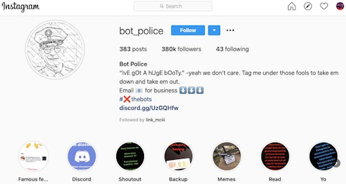 To Instagram’s credit, while many of the bot comments live long enough to garner hundreds or thousands of likes from actual humans who get a kick out of them, its systems do eventually find and remove the spam content. That said, the problem is so widespread that it has become a meme of its own: An Instagram account by the name of Bot Police, which has nearly 400,000 followers, was created solely for the purpose of helping report “those fools to take em down and take em out.” Other ordinary people, meanwhile, will mock the bots by leaving comments like “These bots faster than Travis’s [Scott] Bugatti” on celebrity pages.