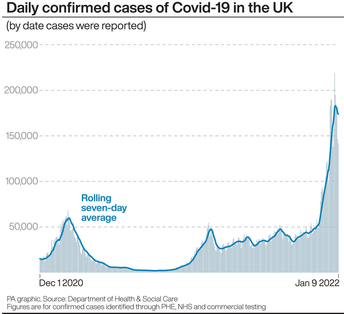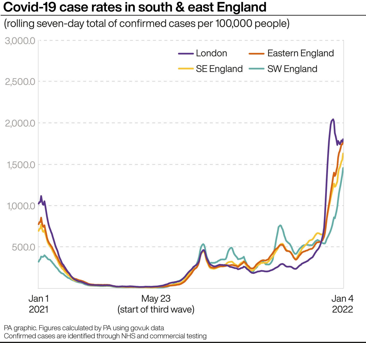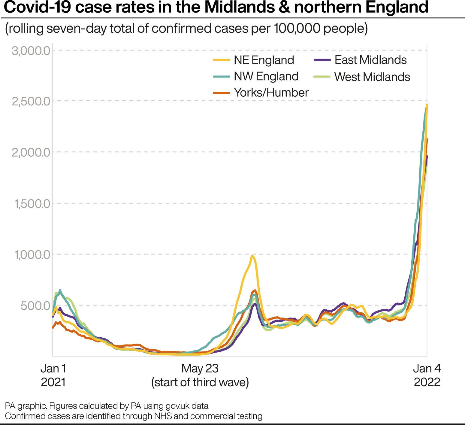 In north-east England, 2,466.2 cases per 100,000 people were recorded in the seven days to January 4, while north-west England recorded 2451.1 and Yorkshire/Humber 2.128.1.