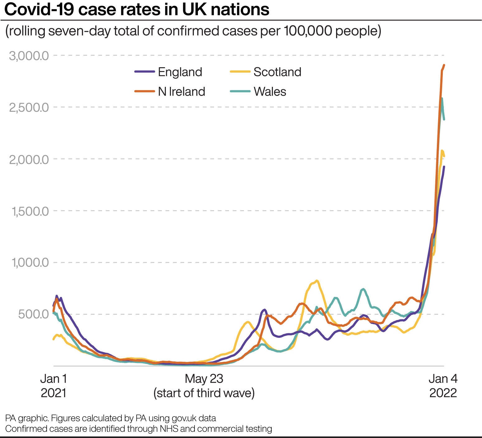 Northern Ireland has the highest rate of the four nations, with 2,905.1 cases per 100,000 people in the seven days to January 4, according to Government data.