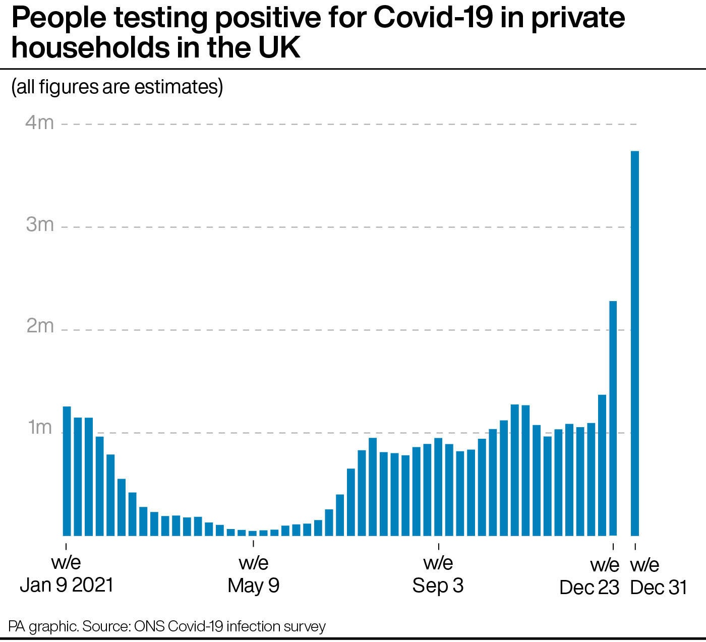 While all parts of the country likely had a record level of infections in the week to December 31 – the latest available estimate – in London there were “early signs in the last few days of 2021 that infections may no longer be increasing, but it is currently too early to suggest if this is a continuing change in trend”, the ONS said.