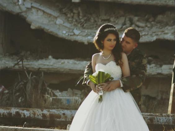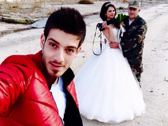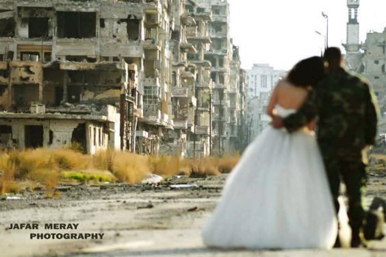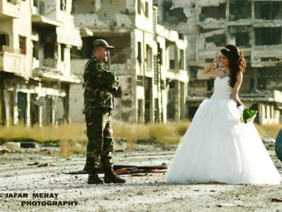 The images show a soldier in the Syrian Army and his new wife, a university student wearing a white gown, stood before the bombed buildings of the old town in Homs, which was besieged for three years until the opposition fell back in 2014.
