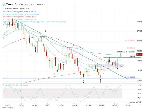 If the QQQ can clear the March and first-quarter high of $321.17 and stay above it, it opens the door back into the low-$330s, then potentially puts $350 in play. The latter is the 61.8% retracement from the 2022 low to the all-time high.
