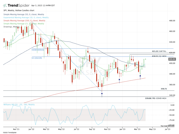 Ultimately, the first-quarter high of $418.31 and the gap-fill level at $421.22 create a key zone for the bulls to clear.