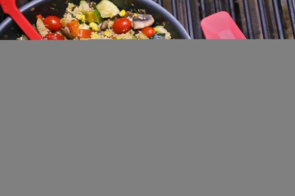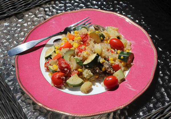 Just imagine onion, garlic, red bell pepper, mushrooms, cherry tomatoes, diced potatoes and corn, blended with quinoa and tied together with white wine, lemon juice and thyme.