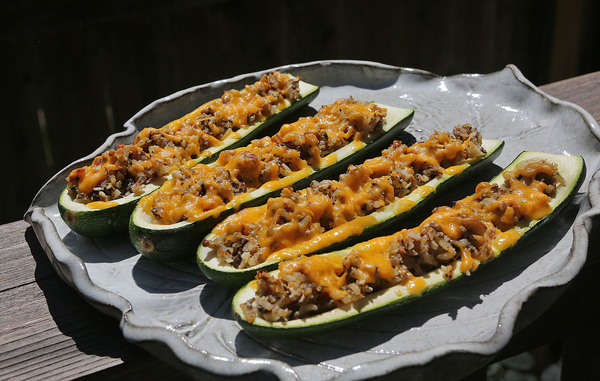 What makes these canoe-shaped zucchini treats better than all those other canoe-shaped zucchini treats you keep hearing about these days is the stuffing. This stuffing is made from sauteed onions and mushrooms mixed with rice and minced nuts, for an earthy and obviously nutty taste.