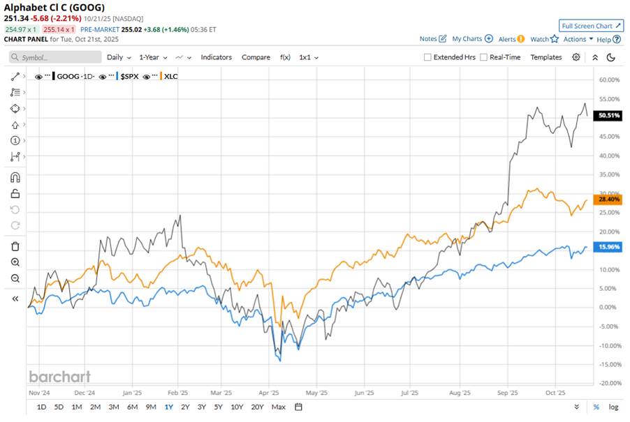 GOOG stock has surged 51.6% over the past 52 weeks, significantly outpacing both the S&P 500 Index’s ($SPX) 15.1% return and the Communication Services Select Sector SPDR Fund’s (XLC) 28.4% rise over the same time frame.