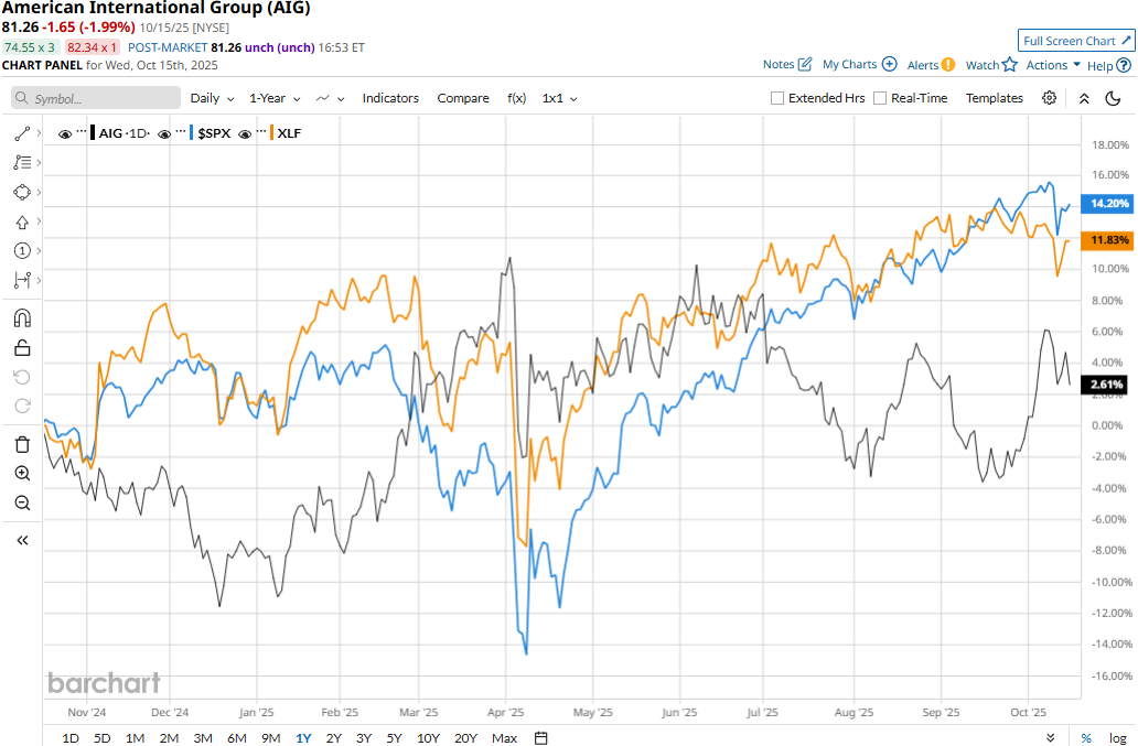 AIG stock prices have inched up 5.6% over the past 52 weeks, notably lagging behind the Financial Select Sector SPDR Fund’s (XLF) 13.5% returns and the S&P 500 Index’s ($SPX) 14.7% gains during the same time frame.