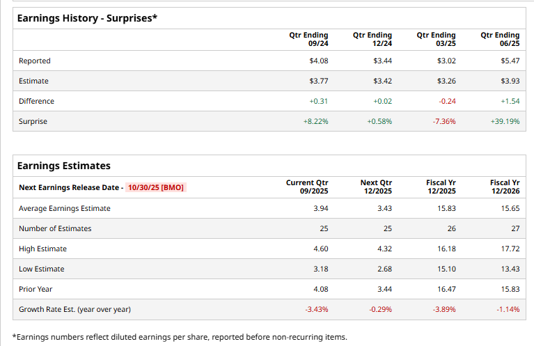 The biotech titan is scheduled to announce its fiscal Q3 earnings for 2025 before the market opens on Thursday, Oct. 30. Before this event, analysts project the company to report a profit of $3.94 per share, down 3.4% from $4.08 per share in the year-ago quarter. The company has surpassed Wall Street’s bottom-line estimates in three of the last four quarters, while missing on another occasion.