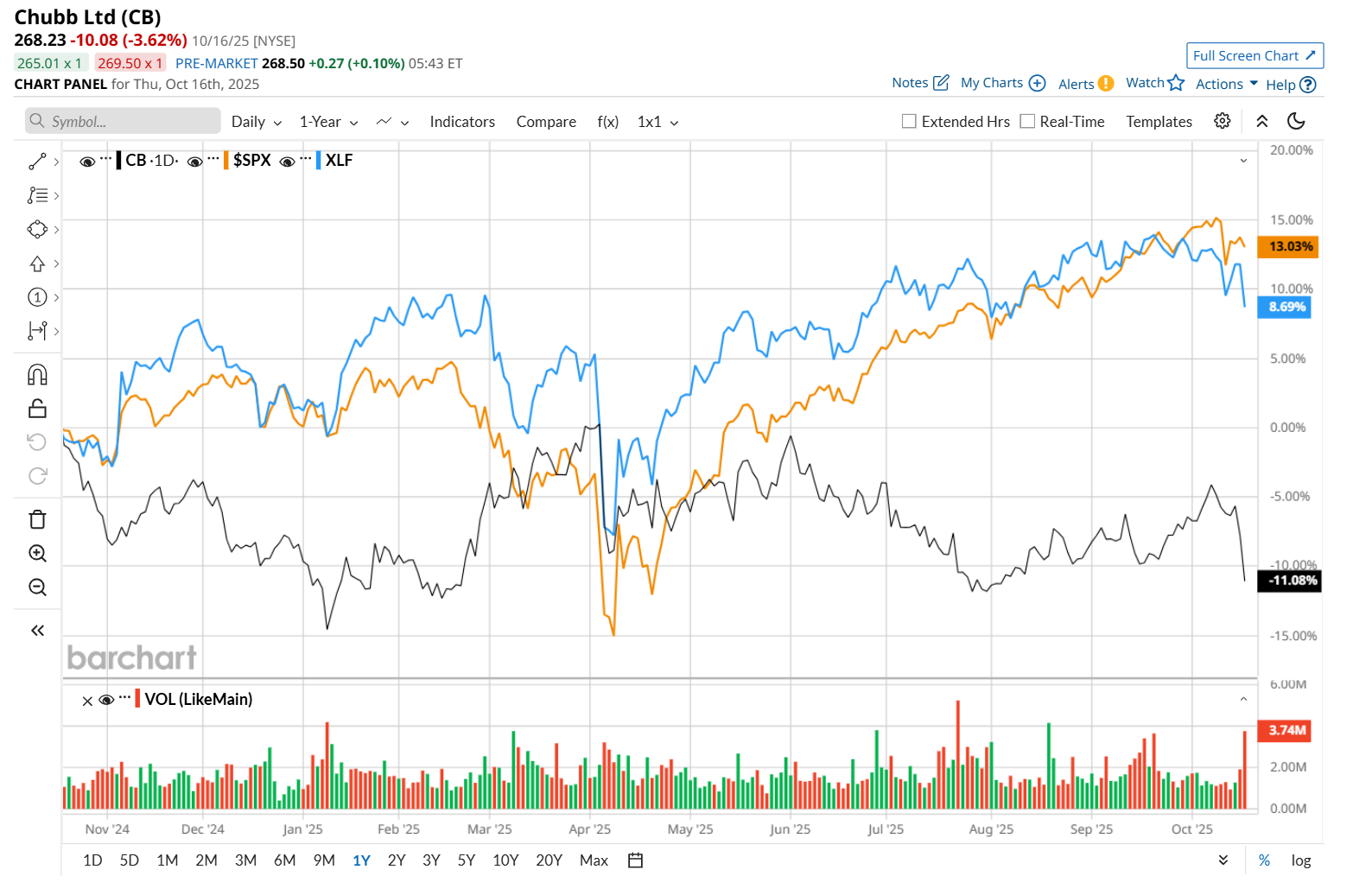 Shares of CB have declined 11.2% over the past 52 weeks, underperforming both the S&P 500 Index's ($SPX) 13.5% return and the Financial Select Sector SPDR Fund’s (XLF) 9.3% rise over the same time frame.
