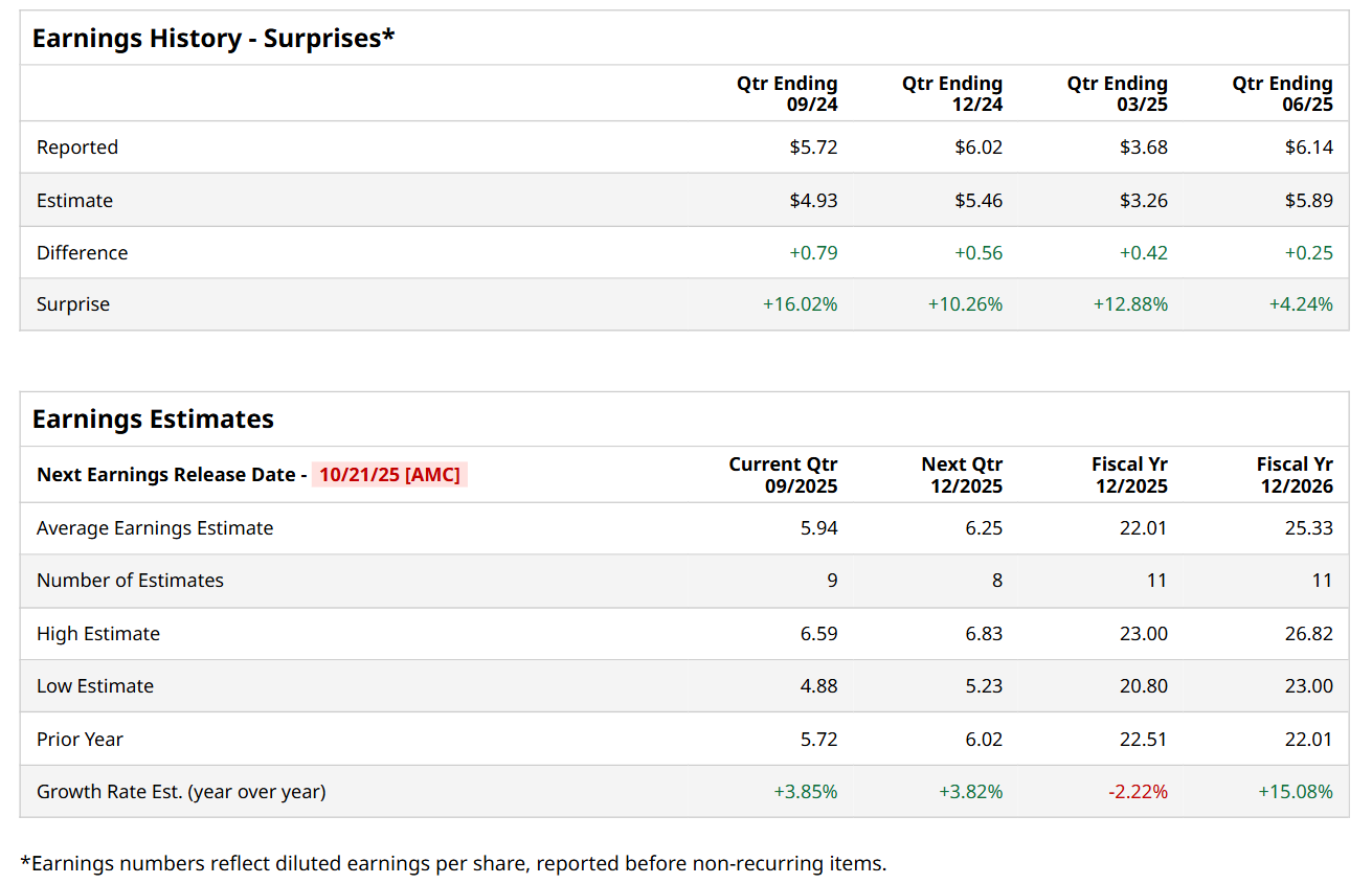 Valued at a market cap of $106.9 billion, Chubb Limited (CB) is a global insurance and reinsurance company that offers a broad suite of insurance products, including commercial and personal property & casualty, personal accident and supplemental health, reinsurance, and life insurance coverage. The Zürich, Switzerland-based company is scheduled to announce its fiscal Q3 earnings for 2025 after the market closes on Tuesday, Oct. 21.