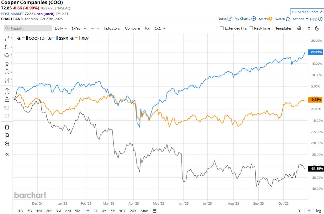 COO stock prices have plummeted 32.4% over the past 52 weeks, notably underperforming the Health Care Select Sector SPDR Fund’s (XLV) 1.5% decline and the S&P 500 Index’s ($SPX) 18.4% gains during the same time frame.