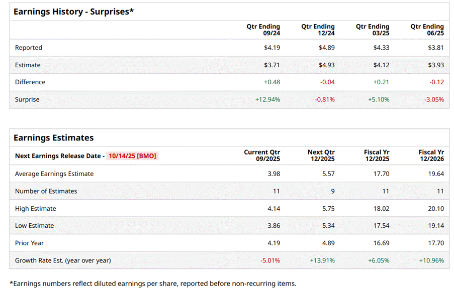 Valued at a market cap of $14.8 billion, Domino's Pizza, Inc. (DPZ) is a pizza company based in Ann Arbor, Michigan. It offers pizzas, bread products, wings, boneless chicken, pastas, oven-baked sandwiches, dips, soft drink products, and desserts under the Domino's brand name through company-owned and franchised stores. It is expected to announce its fiscal Q3 earnings for 2025 before the market opens on Tuesday, Oct. 14.