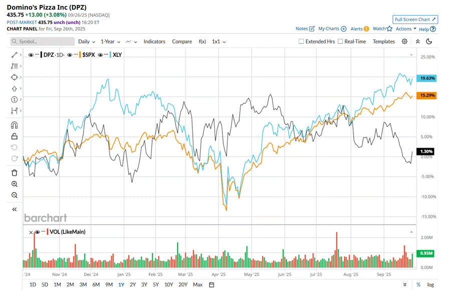 Shares of DPZ have gained marginally over the past 52 weeks, lagging behind both the S&P 500 Index's ($SPX) 15.6% uptick and the Consumer Discretionary Select Sector SPDR Fund’s (XLY) 19.5% return over the same time frame.