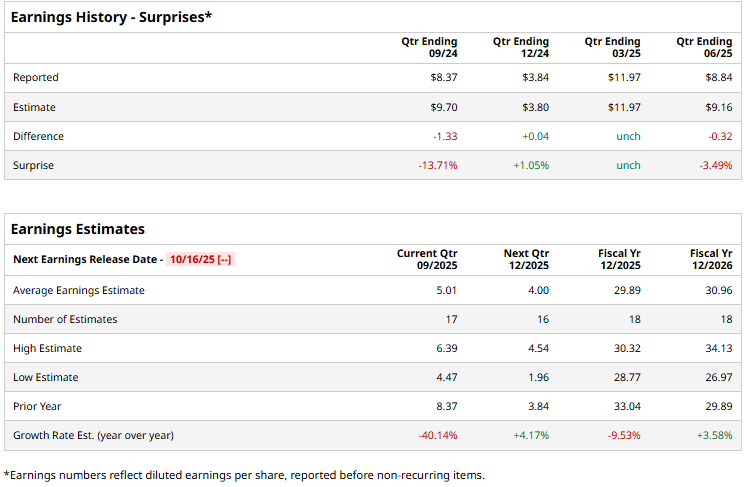 The company is expected to announce its fiscal Q3 earnings for 2025 on Thursday, Oct. 16. Analysts project this health care company to report a profit of $5.01 per share, down 40.1% from $8.37 per share in the year-ago quarter. The company has met or surpassed Wall Street’s bottom-line estimates in two of the last four quarters, while missing on two other occasions.
