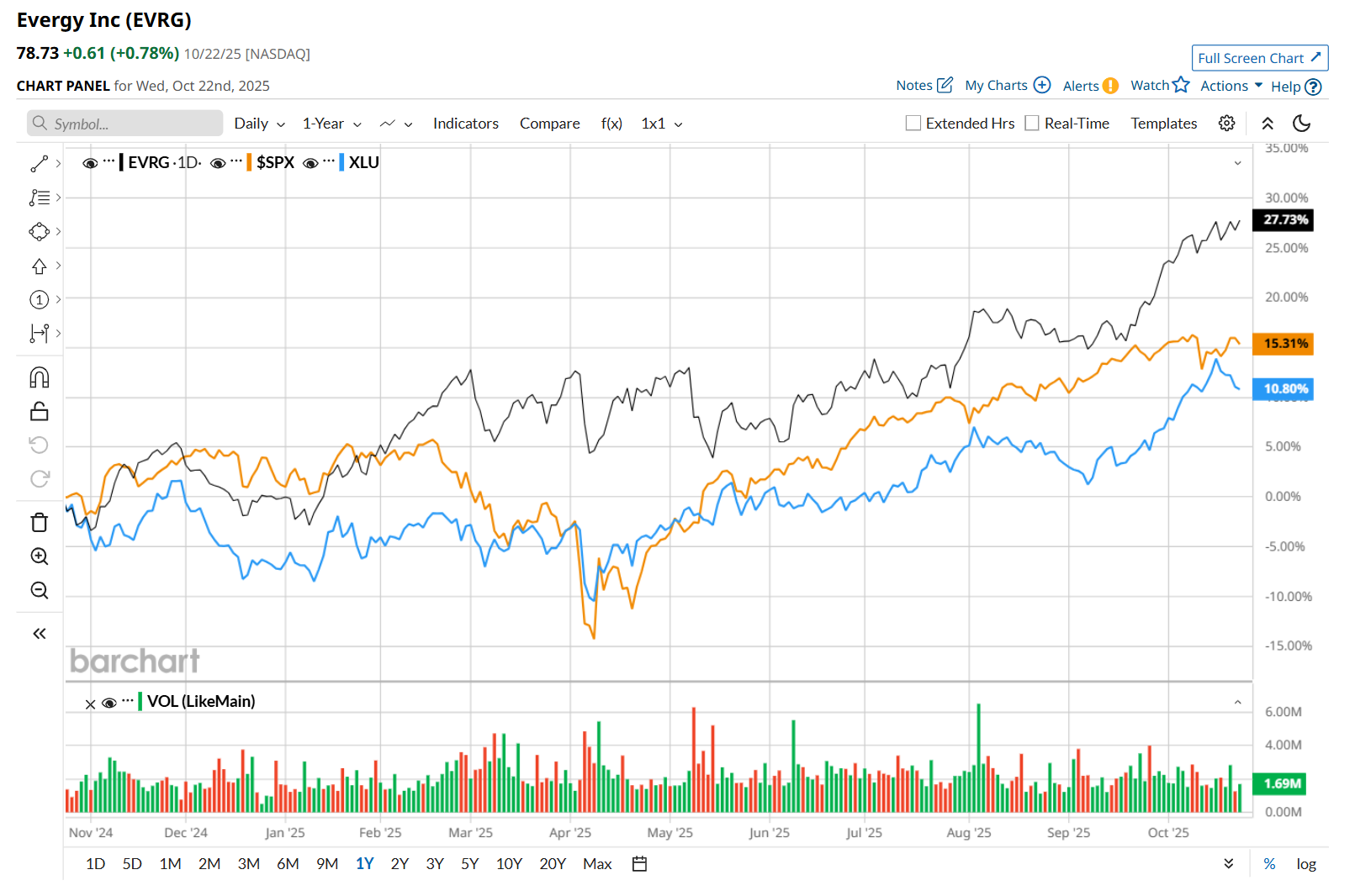 Shares of Evergy have rallied 28% over the past 52 weeks, outpacing both the S&P 500 Index's ($SPX) 14.5% return and the Utilities Select Sector SPDR Fund’s (XLU) 11.1% rise over the same time frame.