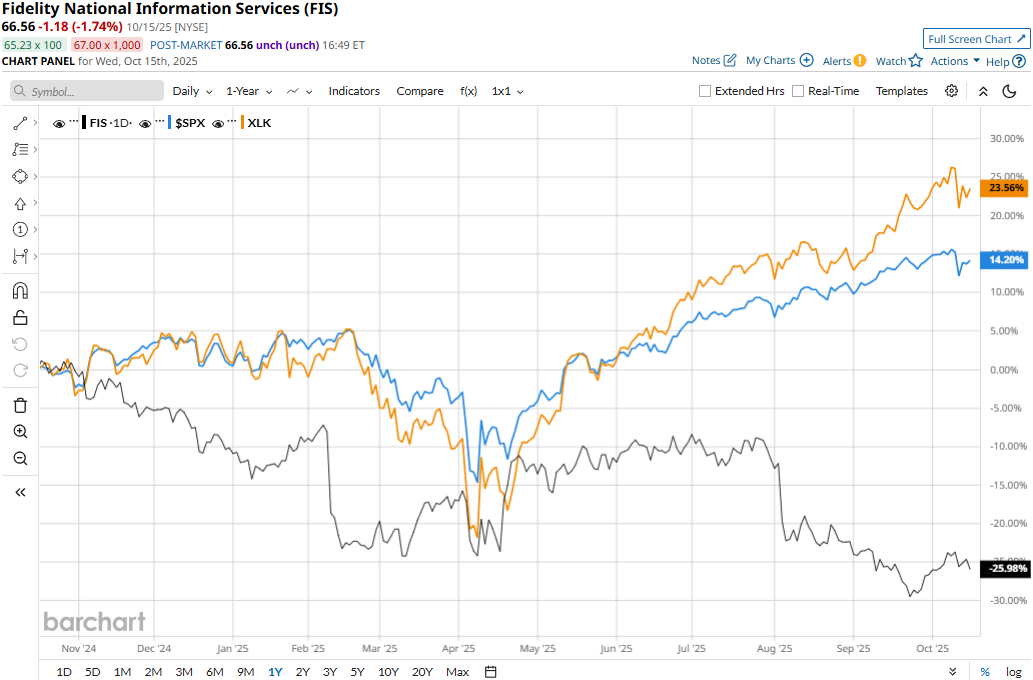 FIS stock prices have plummeted 25.3% over the past 52 weeks, notably underperforming the Technology Select Sector SPDR Fund’s (XLK) 24.3% surge and the S&P 500 Index’s ($SPX) 14.7% returns during the same time frame.