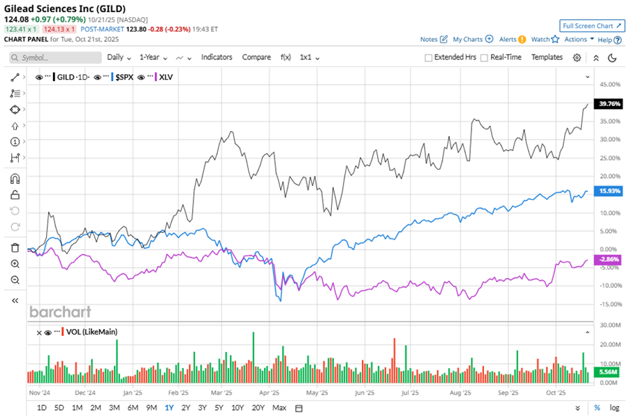 GILD stock has notably outperformed the S&P 500 Index’s ($SPX) 15.1% gains over the past 52 weeks, with shares up 43.8% during this period. Similarly, it considerably outperformed the Health Care Select Sector SPDR Fund’s (XLV) 4.1% losses over the same time frame.