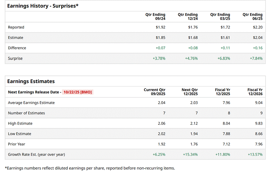 McLean, Virginia-based Hilton Worldwide Holdings Inc. (HLT) is a hospitality company that manages, franchises, owns, and leases hotels and resorts. Valued at a market cap of $60.4 billion, the company operates a portfolio of luxury, lifestyle, full-service, focused-service, all-suites, timeshare, and economy hotels under various well-known brands. It is expected to announce its fiscal Q3 earnings for 2025 before the market opens on Wednesday, Oct. 22.