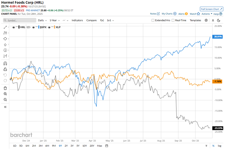 Shares of Hormel Foods have declined 22.8% over the past 52 weeks, lagging behind both the S&P 500 Index's ($SPX) 18.4% increase and the Consumer Staples Select Sector SPDR Fund’s (XLP) 2.6% dip over the same period.