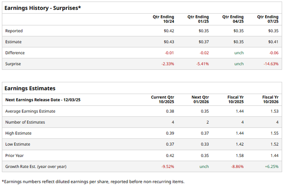 The Austin, Minnesota-based company is expected to announce its fiscal Q4 2025 results soon. Ahead of this event, analysts expect Hormel Foods to report an adjusted EPS of $0.38, down 9.5% from $0.42 in the year-ago quarter. It has met Wall Street's earnings estimates in one of the last four quarters while missing on three other occasions.