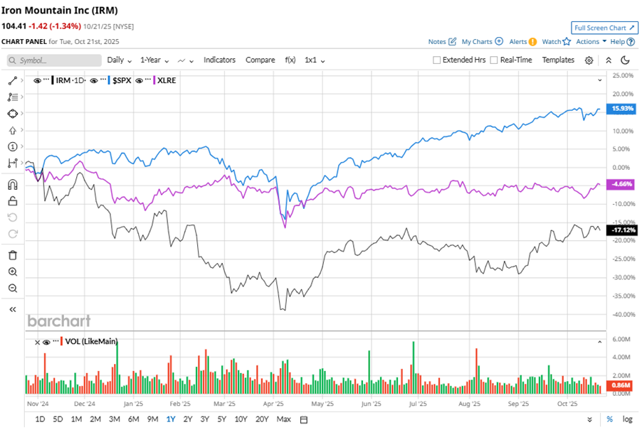 IRM stock has considerably underperformed the S&P 500 Index’s ($SPX) 15.1% gains over the past 52 weeks, with shares down 15.4% during this period. Similarly, it underperformed the Real Estate Select Sector SPDR Fund’s (XLRE) 3.4% downtick over the same time frame.