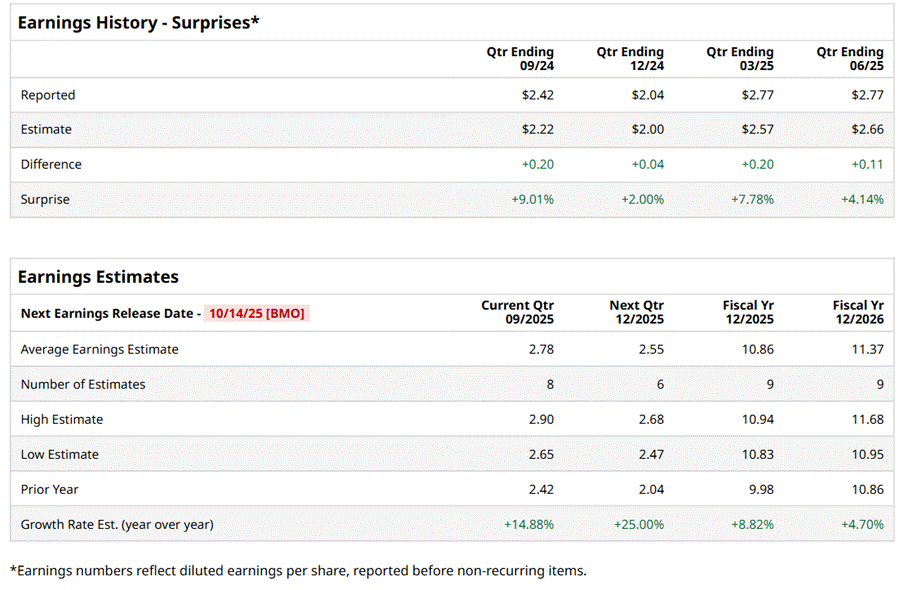New Brunswick, New Jersey-based Johnson & Johnson (JNJ) is a healthcare company recognized for its leadership in pharmaceuticals, medical technologies, and consumer health products. Valued at a market cap of $428 billion, the company focuses on improving human health and well-being through scientific innovation, patient-centered care, and a commitment to addressing some of the world’s most pressing health challenges. The company is expected to announce its fiscal Q3 earnings for 2025 before the market opens on Tuesday, Oct. 14.