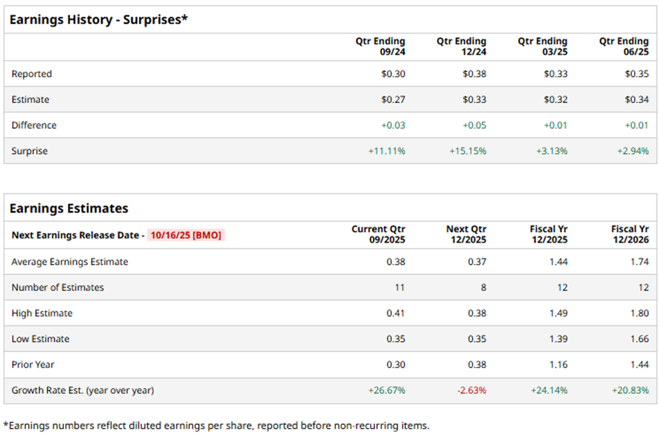 The Cleveland, Ohio-based company is scheduled to announce its fiscal Q3 2025 results before the market opens on Thursday, Oct. 16. Ahead of this event, analysts forecast KeyCorp to report an EPS of $0.38, up 26.7% from $0.30 in the year-ago quarter. It has surpassed Wall Street's earnings estimates in the last four quarters.