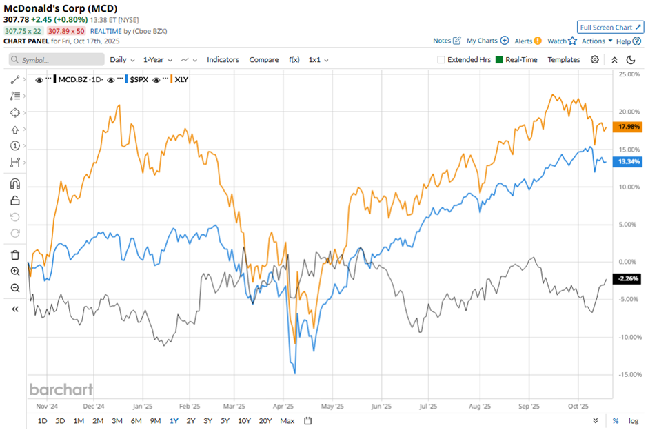 Shares of McDonald's have fallen 2.3% over the past 52 weeks, underperforming both the S&P 500 Index's ($SPX) 13.6% gain and the Consumer Discretionary Select Sector SPDR Fund's (XLY) 17.5% increase over the period.