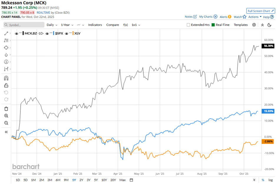 MCK stock has climbed 54.9% over the past 52 weeks, outpacing the broader S&P 500 Index's ($SPX) 15.1% rise and the Health Care Select Sector SPDR Fund's (XLV) 3.1% decrease over the same period.
