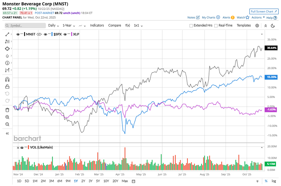 MNST stock has outperformed the S&P 500 Index’s ($SPX) 14.5% gains over the past 52 weeks, with shares up 30.1% during this period. Similarly, it notably outperformed the Consumer Staples Select Sector SPDR Fund’s (XLP) 2.8% dip over the same time frame.