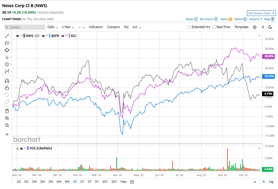 NWS stock has underperformed the S&P 500 Index’s ($SPX) 16.2% gains over the past 52 weeks, with shares up 9% during this period. Similarly, it underperformed the Communication Services Select Sector SPDR ETF’s (XLC) 27.6% uptick over the same time frame.