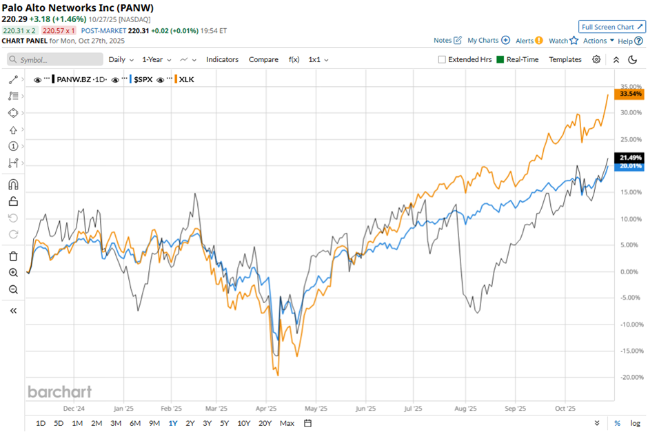 Shares of Palo Alto Networks have soared 20.2% over the past 52 weeks, outpacing the broader S&P 500 Index's ($SPX) 18.4% return. However, the stock has lagged behind the Technology Select Sector SPDR Fund's (XLK) 29.8% surge over the same period.