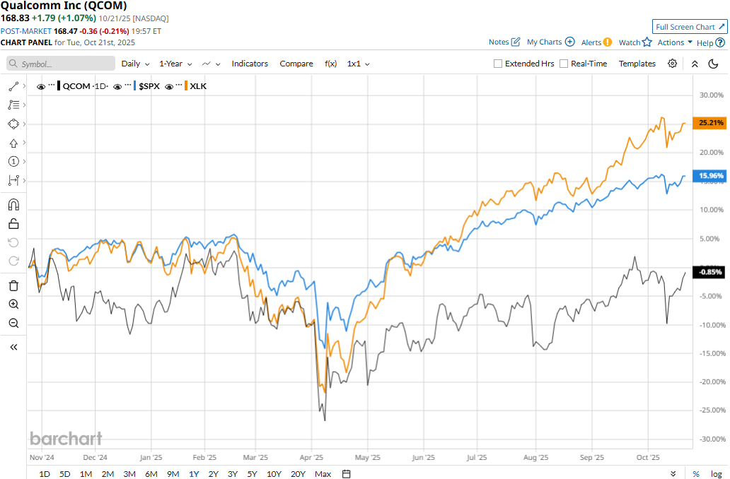 QCOM stock prices have observed a marginal 11 bps dip over the past 52 weeks, notably underperforming the Technology Select Sector SPDR Fund’s (XLK) 24.3% surge and the S&P 500 Index’s ($SPX) 15.1% returns during the same time frame.