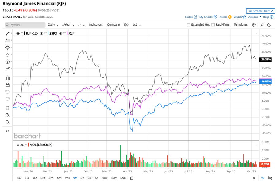 RJF stock has outperformed the S&P 500 Index’s ($SPX) 17.4% gains over the past 52 weeks, with shares up 32.2% during this period. Similarly, it outperformed the Financial Select Sector SPDR Fund’s (XLF) 18% gains over the same time frame.
