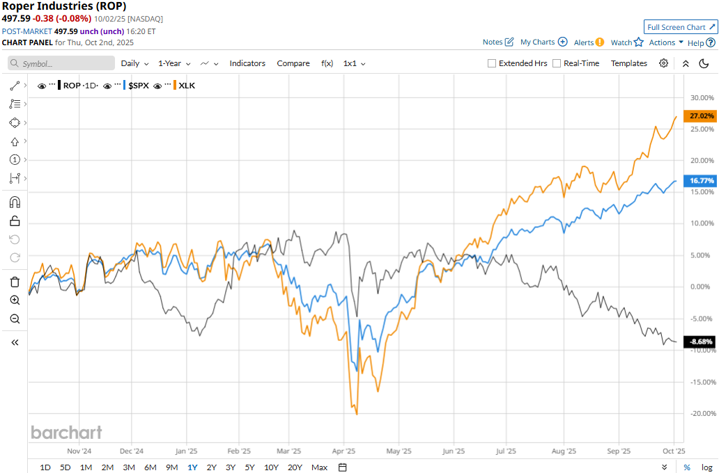 ROP stock prices have declined 9.8% over the past 52 weeks, notably underperforming the S&P 500 Index’s ($SPX) 17.6% gains and the Technology Select Sector SPDR Fund’s (XLK) 29% surge during the same time frame.