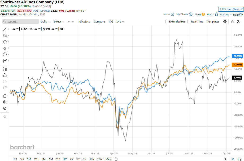 LUV stock prices have gained 4.3% over the past 52 weeks, notably underperforming the S&P 500 Index’s ($SPX) 17.2% surge and the Industrial Select Sector SPDR Fund’s (XLI) 14.5% returns during the same time frame.