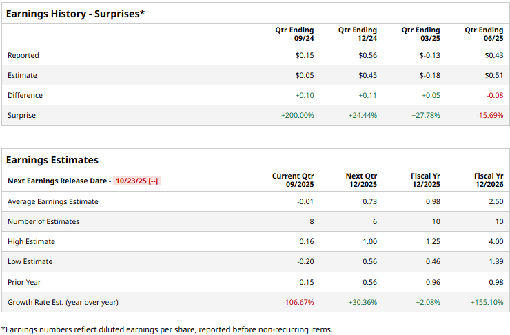 The airline giant is set to release its third-quarter results before the market opens on Thursday, Oct. 23. Ahead of the event, analysts expect Southwest to report a non-GAAP loss of $0.01 per share, down 106.7% from a profit of $0.15 per share reported in the year-ago quarter. The company has surpassed Wall Street’s bottom-line estimates thrice over the past four quarters, while missing the projections on one other occasion.