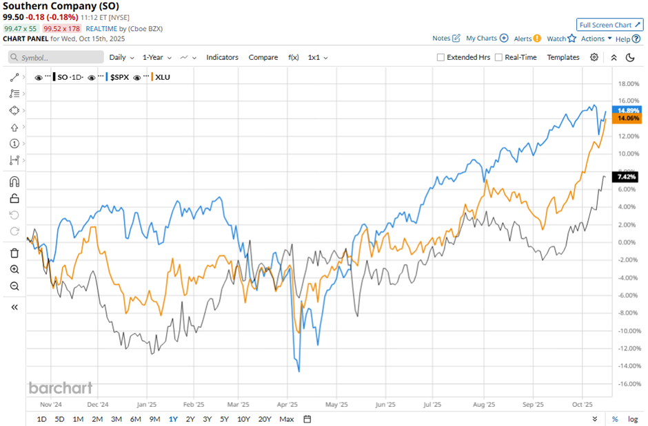 SO stock has gained 9.9% over the past 52 weeks, underperforming both the S&P 500 Index's ($SPX) 15.5% return and the Utilities Select Sector SPDR Fund's (XLU) 15.2% increase over the same period.