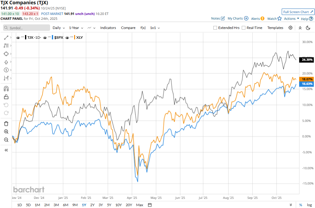 TJX stock prices have surged 24.3% over the past 52 weeks, notably outperforming the S&P 500 Index’s ($SPX) 16.9% gains and the Consumer Discretionary Select Sector SPDR Fund’s (XLY) 18.7% returns over the same time frame.