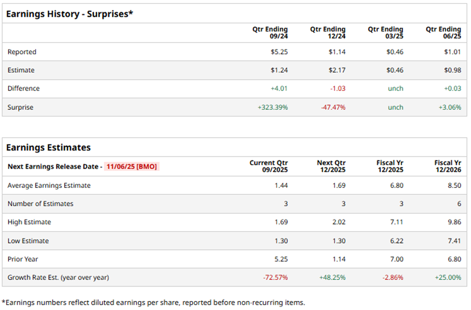 The Irving, Texas-based company is expected to unveil its fiscal Q3 2025 results before the market opens on Thursday, Nov. 6. Before the event, analysts anticipate Vistra to report an EPS of $1.44, down 72.6% from $5.25 in the year-ago quarter. It has surpassed or met Wall Street's bottom-line estimates in three of the past four quarters while missing on another occasion.
