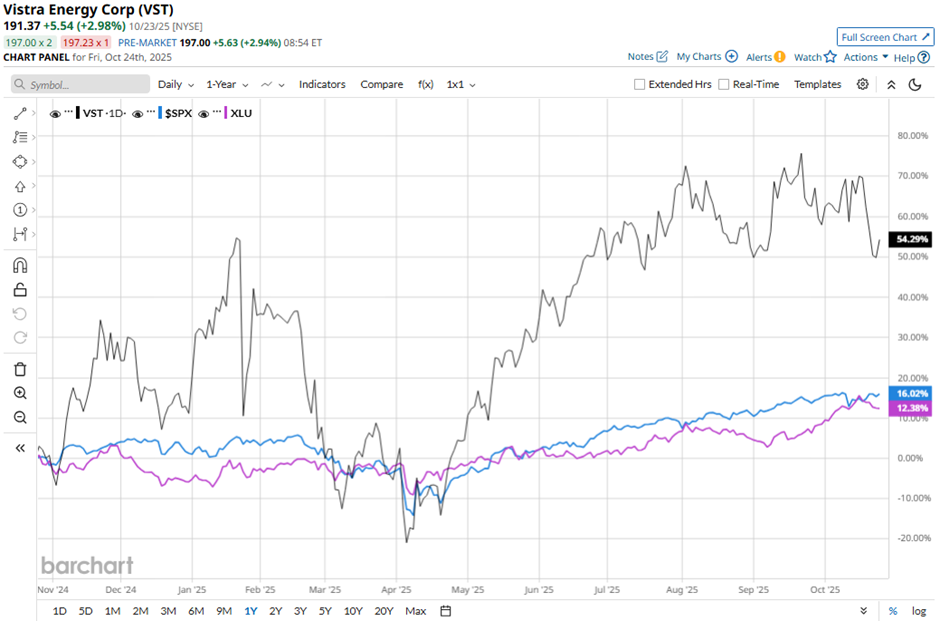 VST stock has jumped 57.7% over the past 52 weeks, outpacing the S&P 500 Index's ($SPX) 16.2% gain and the Utilities Select Sector SPDR Fund's (XLU) 11.4% increase over the same period.