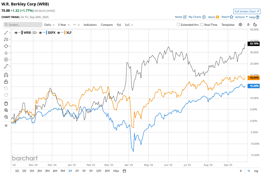WRB has gained 33.8% over the past 52 weeks, outpacing both the S&P 500 Index’s ($SPX) 15.6% rise and the Financial Select Sector SPDR Fund’s (XLF) 19.6% return over the same time frame.