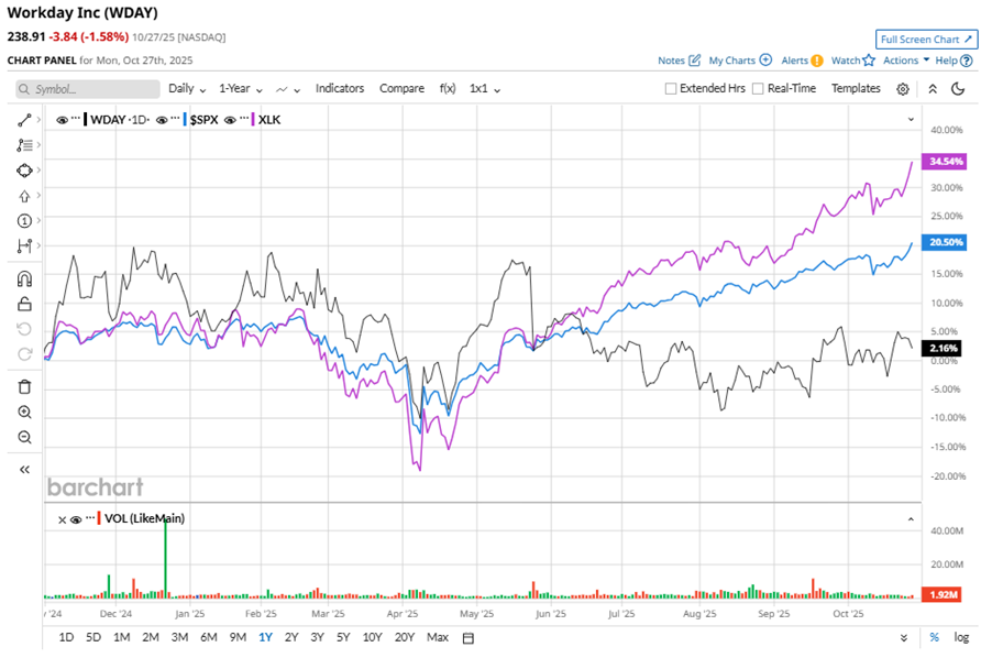 WDAY stock has underperformed the S&P 500 Index’s ($SPX) 18.4% gains over the past 52 weeks, with shares up marginally during this period. Similarly, it underperformed the Technology Select Sector SPDR Fund’s (XLK) 29.8% gains over the same time frame.