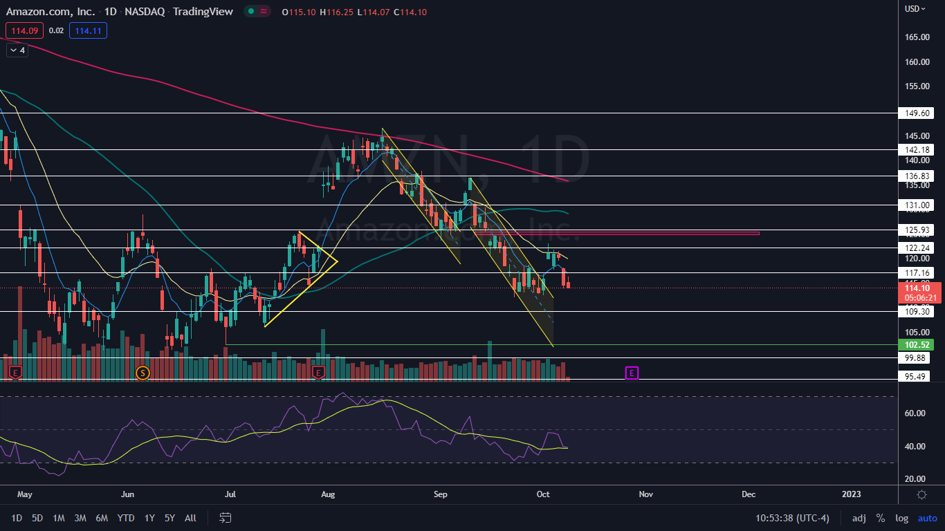 - Amazon has been trading in a fairly consistent downtrend since Aug. 16, although recently the stock is holding in a short uptrend. If Amazon breaks down bearishly from the inside bar pattern, bullish traders will want to see the stock print a bullish reversal candlestick, such as a doji or hammer candlestick, above $112.45, otherwise, the uptrend will be negated, and the longer-term downtrend will likely resume.