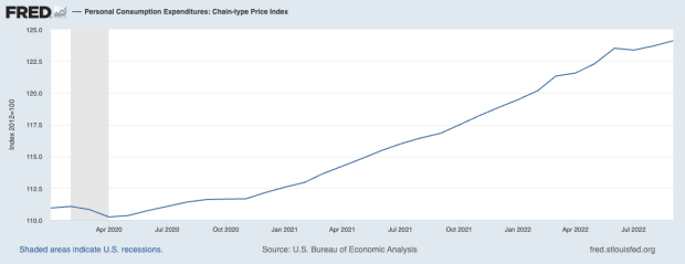 U.S. Bureau of Economic Analysis, Personal Consumption Expenditures: Chain-type Price Index [PCEPI], retrieved from FRED, Federal Reserve Bank of St. Louis; https://fred.stlouisfed.org/series/PCEPI, November 14, 2022.