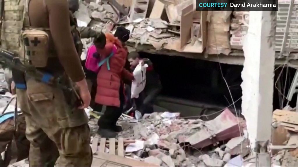 Video posted online by Ukrainian forces showed elderly women and mothers with small children bundled in winter clothing being helped as they climbed up a steep pile of debris from the plant's rubble via ladders.